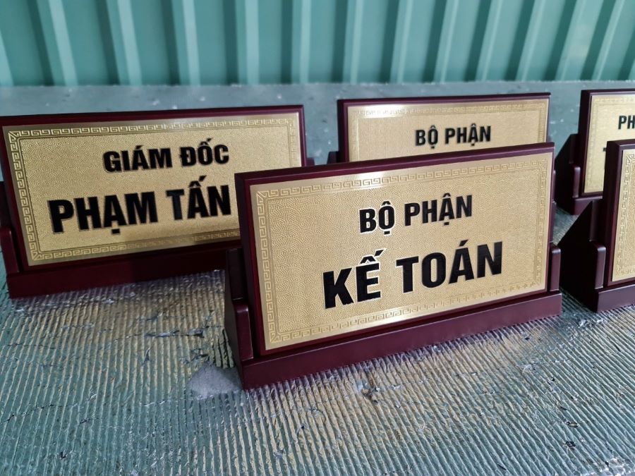 Biển chức năng để bàn với đế gỗ, được đặt trong phòng làm việc của cá nhân đảm nhiệm các chức vụ quan trọng trong công ty. Hoặc đặt trong phòng họp, phòng hội nghị, tạo nên một không gian trang trọng và chuyên nghiệp.